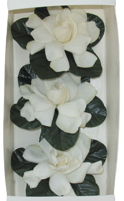 This is how gardenias come packed - 3 blooms, no stems, with a foliage collar (which might be either real foliage or fake), packed in one plastic wrapped box.